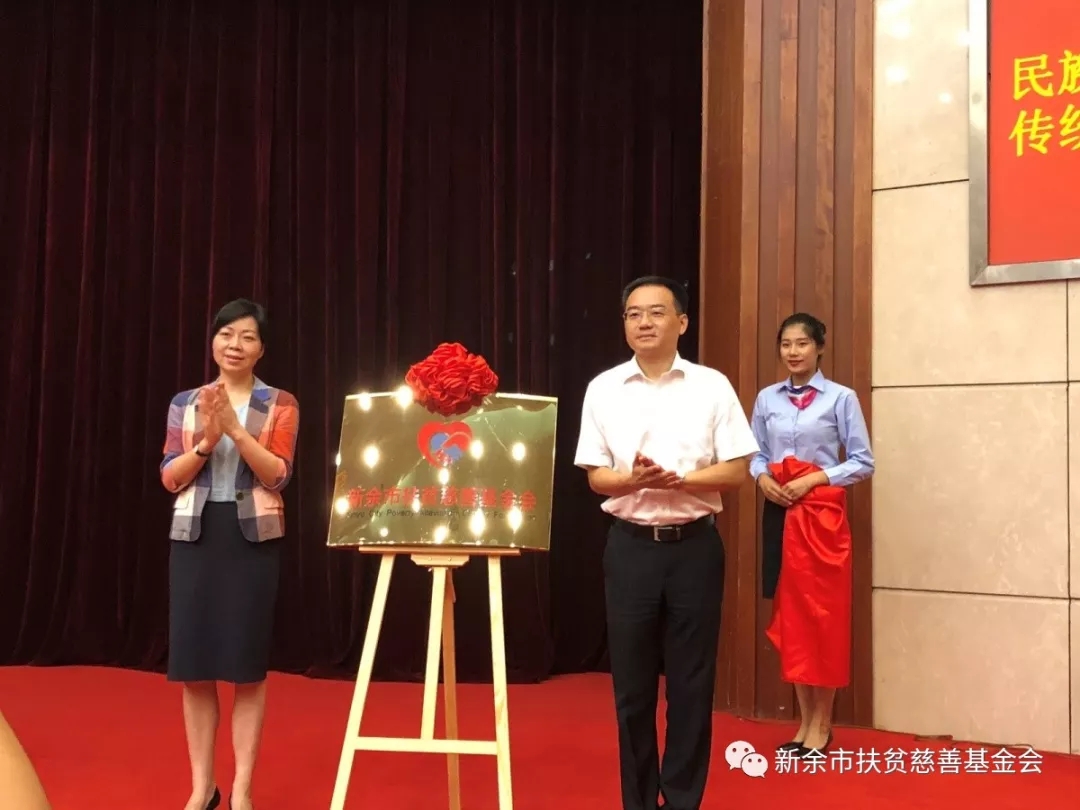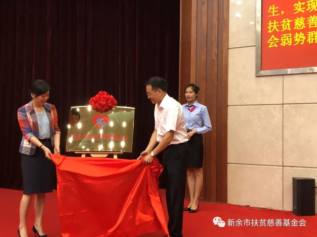 曾萍书记和李新华部长为新余市扶贫慈善基金会揭牌,并表示热烈的祝贺!