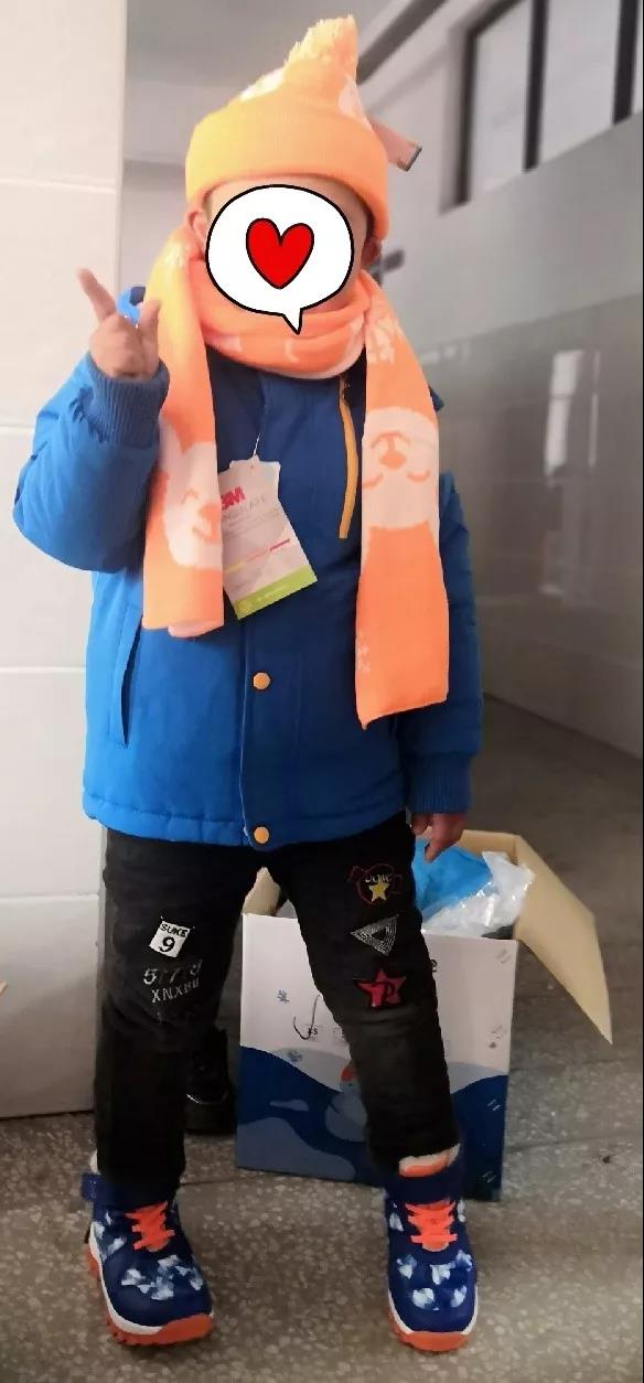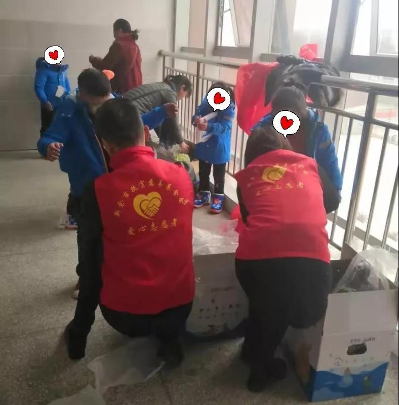 温暖发放仪式在逸夫楼二楼会议室举行,基金会的志愿者们和老师、家长一起帮助孩子们试穿新的棉衣、棉靴等物品。