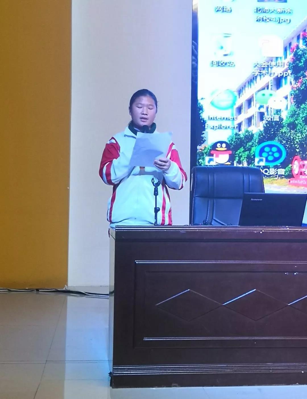 贫困生代表廖欣雨同学上台演讲,感谢爱心人士给予的帮助让我们可以去追逐梦想,我们一定会好好学习,将来回报社会也把这份爱传递下去。