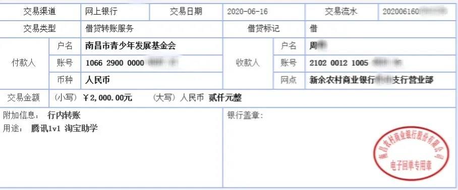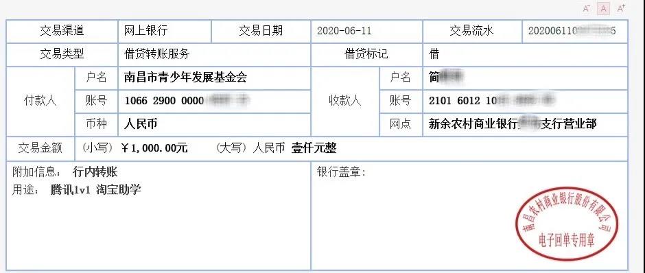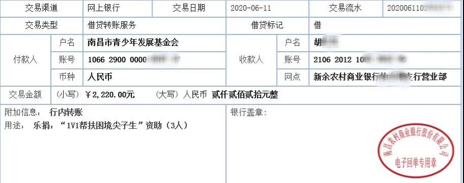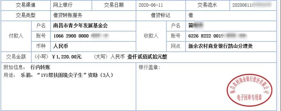 关爱新余困境学生在行动,在第一批为20位困境学生捐赠助学金的基础上,新余市扶贫慈善基金会继续通过南昌青少年发展基金会发起腾讯线上筹款,并在2020年6月17日以转账的形式给新余市的31位困境学生发放助学金,其中27位小初中困境学生每人700元、1位高中困境学生1700元、2位困境尖子小学生每人1220元、1位困境尖子高中生2220元。截至目前共帮扶51位新余困境学生,发放助学金达39260元。
