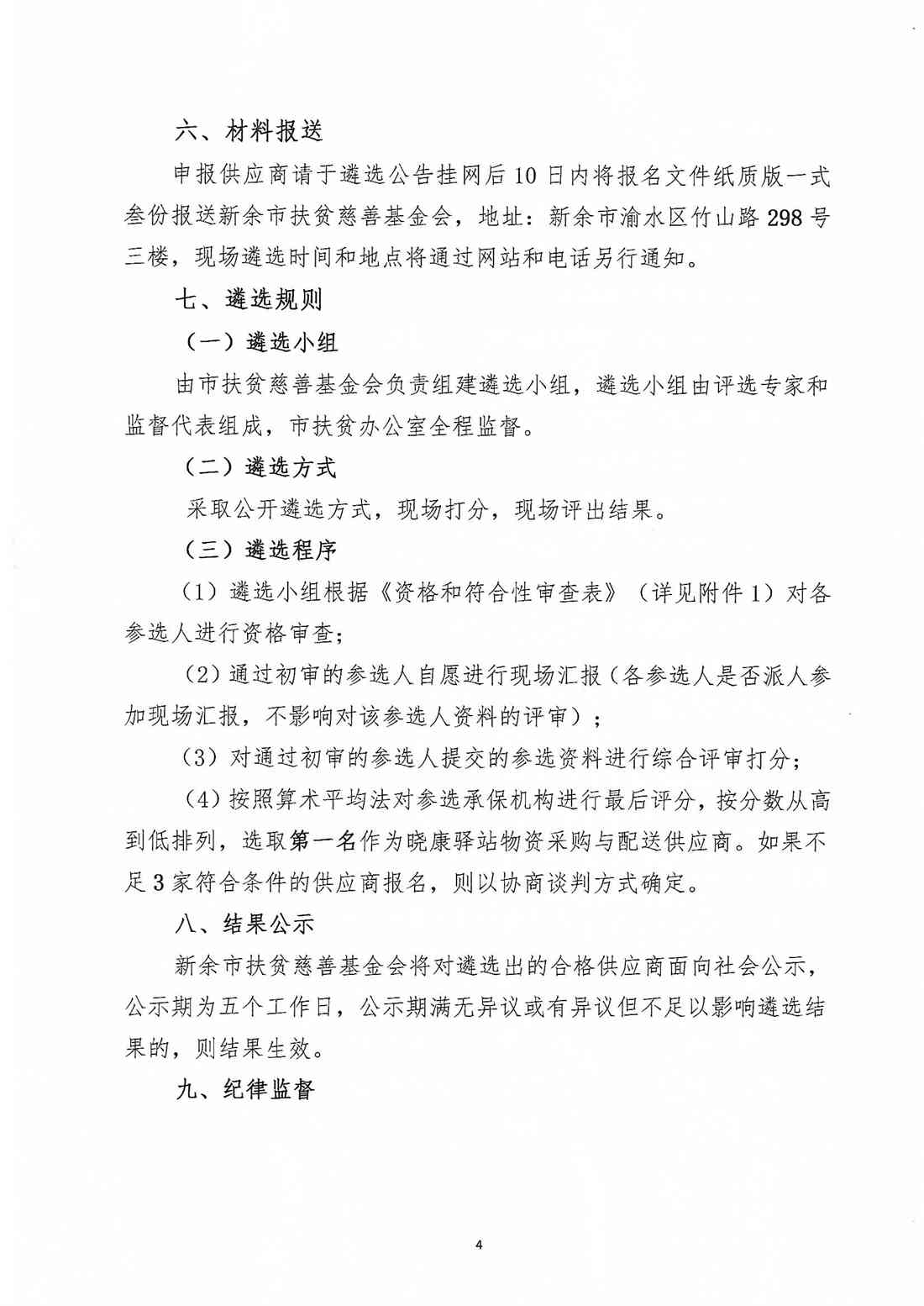 1.请参加竞争性遴选的供应商在公告发出10日内将公告内所需材料上交至新余市扶贫慈善基金会,逾期无效。