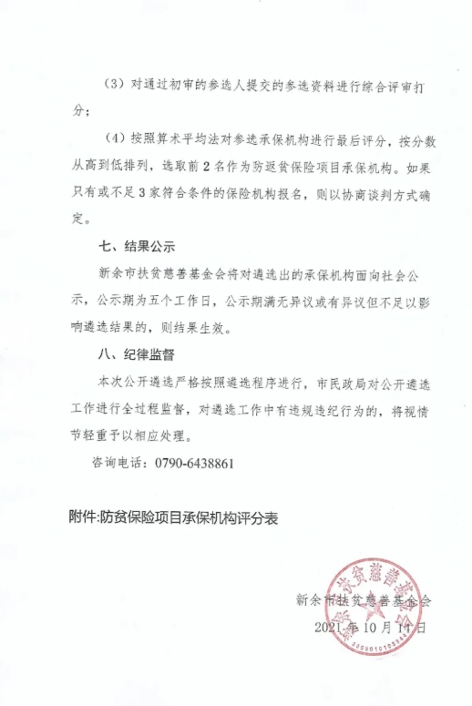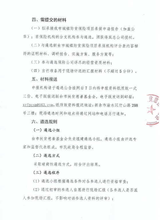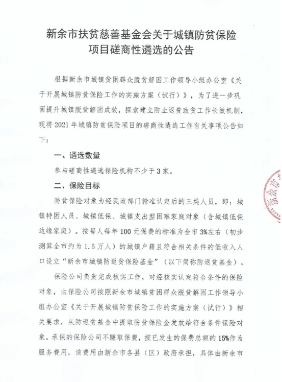 【重要通知】新余市扶贫慈善基金会关于城镇防贫保险项目磋商性遴选公告