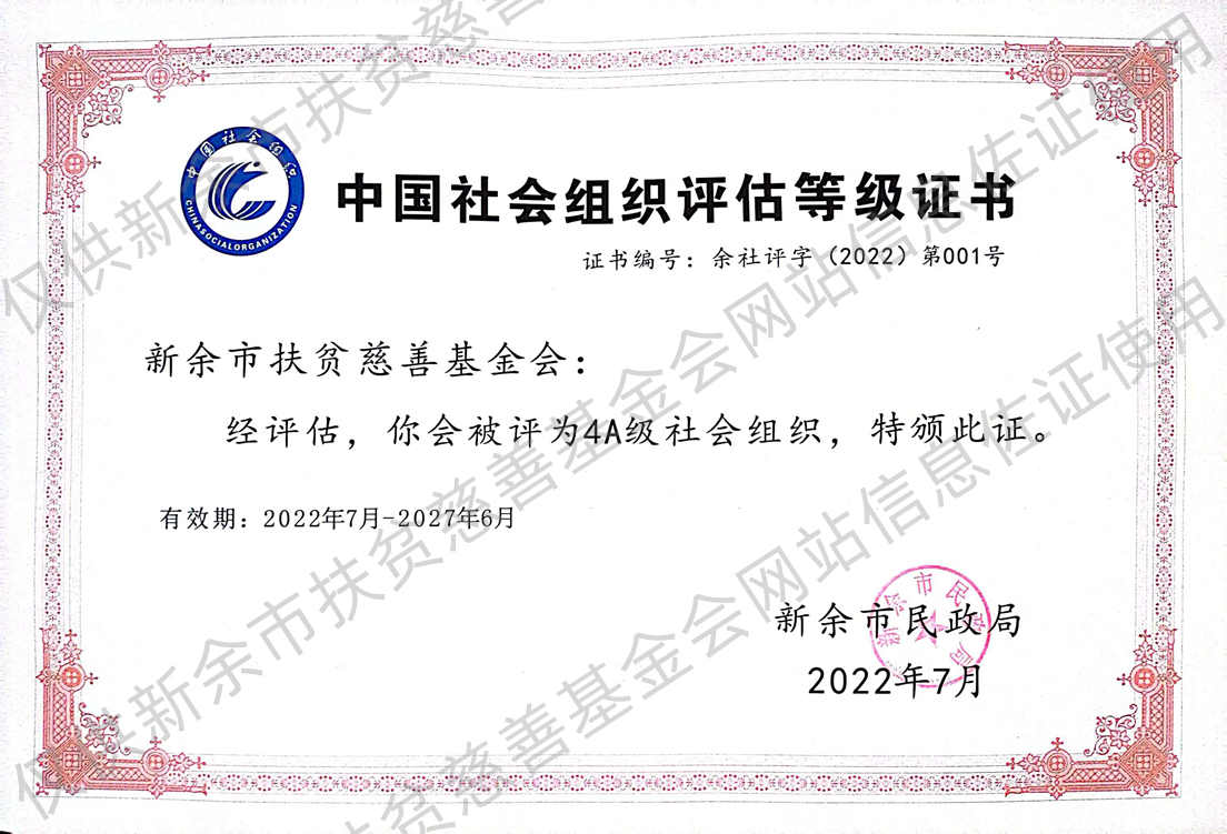 2022年新余市扶贫慈善基金会参加社会组织等级评估,被评为4A级社会组织。