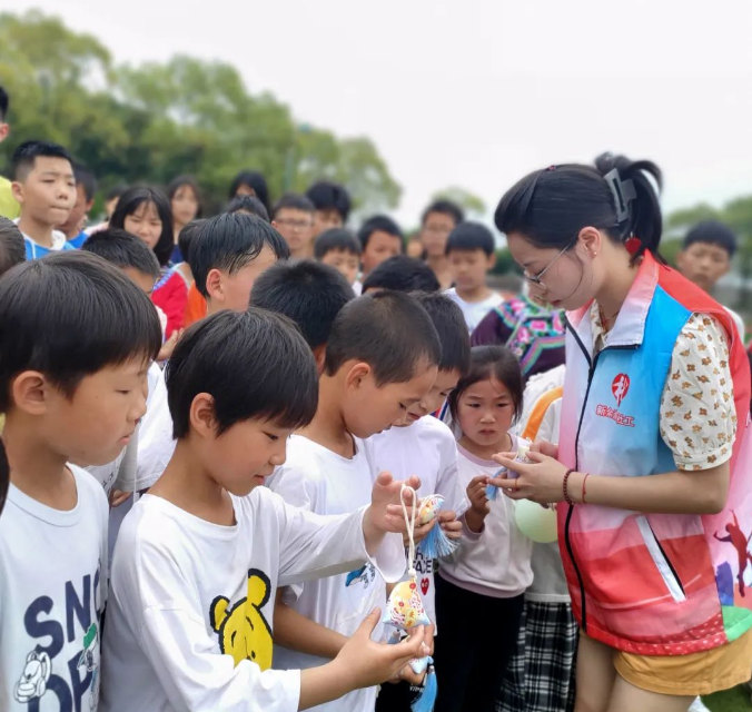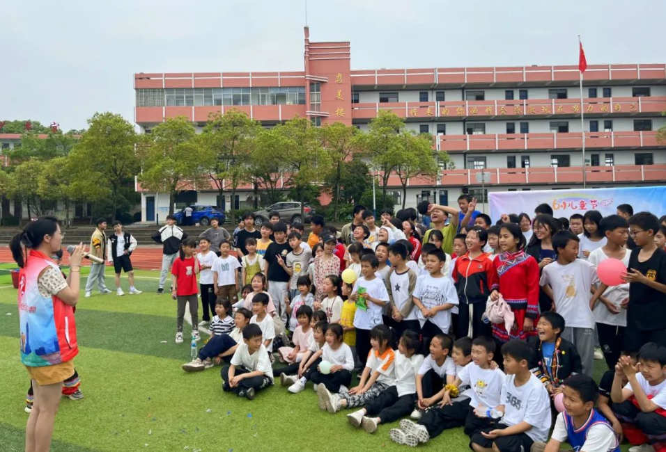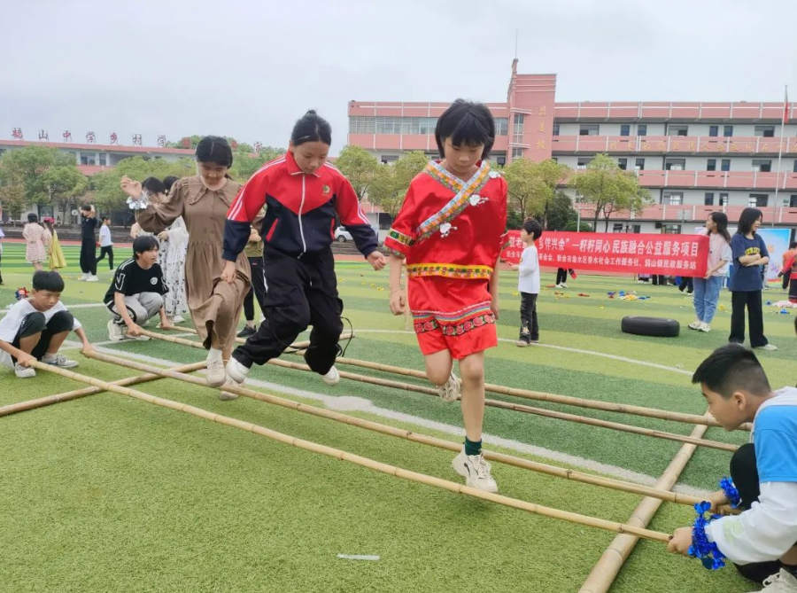 30日上午,志愿者们来到鹄山中学,活动现场鹄山镇的彝族儿童们穿着彝族服饰、带着竹竿来到校园,教其他汉族儿童跳特色竹竿舞。100多名学生们通过表演民族节目来庆祝六一儿童节的到来,孩子们一起体验彝族的竹竿舞、丢沙包、投壶等特色游戏,并分享了零食与香包,现场气氛欢乐。