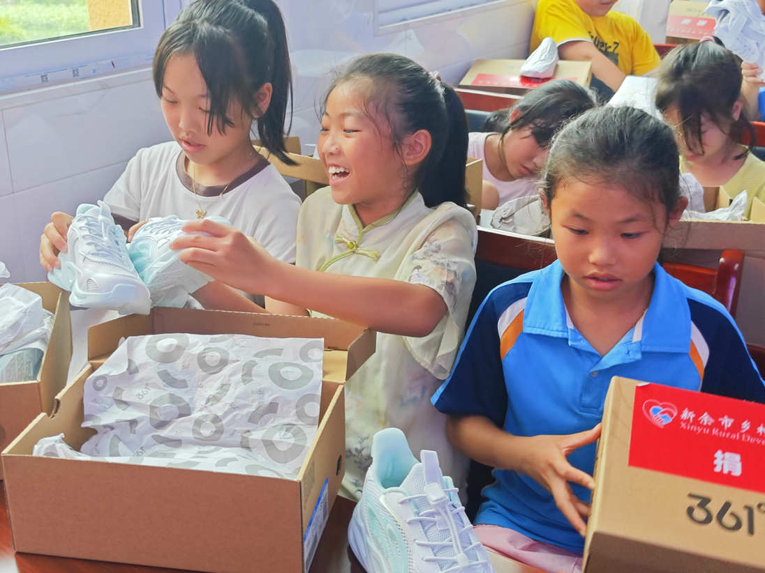 仪式开始后,工作人员将鞋子发放到每一位孩子的手中,收到新鞋子后,孩子们非常喜悦迫不及待地试了起来,并和身边的小伙伴一起分享自己的新鞋。