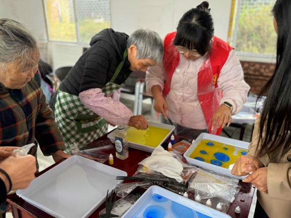 26日活动现场,志愿者拿出准备好的水拓材料和工具,带领双林镇麻田村的老人们一起感受古老的水拓艺术。活动中老人们相互协作,共同探索水拓艺术的奥秘。同时对新奇的非遗传承充满好奇心,每个老人都耐心地尝试着不同的颜料组合和图案设计。他们一起分享着创作的喜悦,欢声笑语回荡在整个院里。