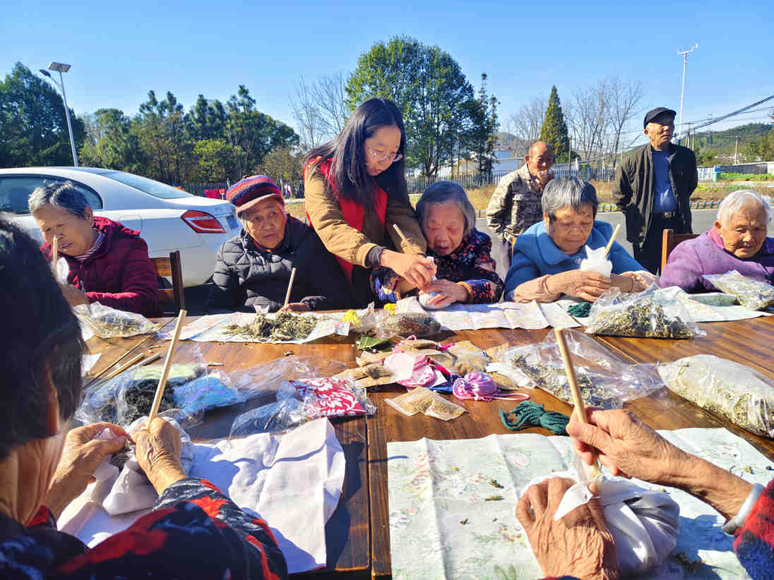 28日活动当天,阳光透过树叶的缝隙,洒在凤阳镇西茶村幸福院的每一个角落,为这场特别的聚会增添了几分温馨。在社工的指导下老人们动手制作艾草锤和桂花香囊。有的老人手法娴熟,有的则略显生疏,但大家都互帮互助,分享着各自的技巧与心得,空气中弥漫着艾草与桂花的清新香气和那份难以言喻的温情。