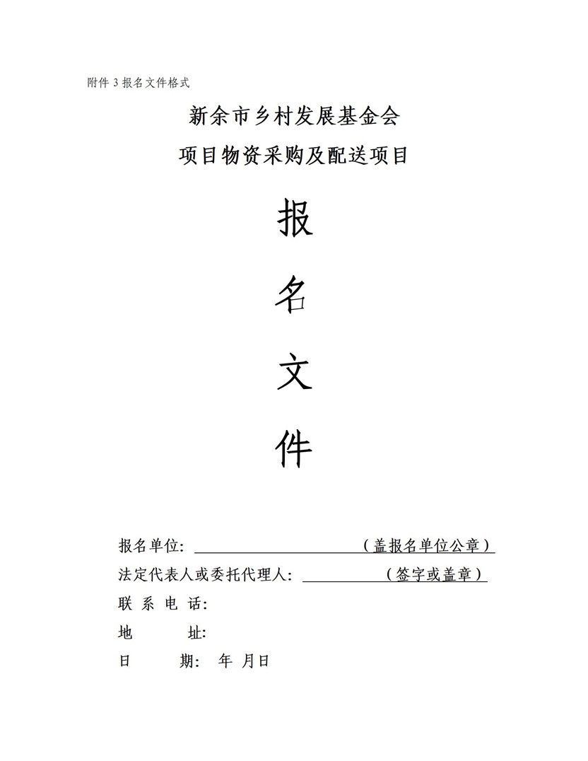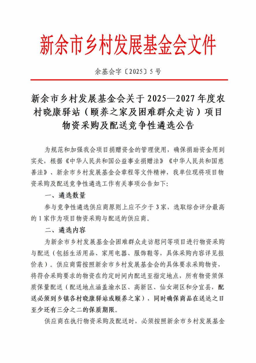 为规范和加强我会项目捐赠资金的管理使用,确保捐助资金用到实处,根据《中华人民共和国公益事业捐赠法》《中华人民共和国慈善法》、新余市乡村发展基金会章程等文件精神,我单位现将项目物资采购及配送竞争性遴选工作有关事项公告如下: