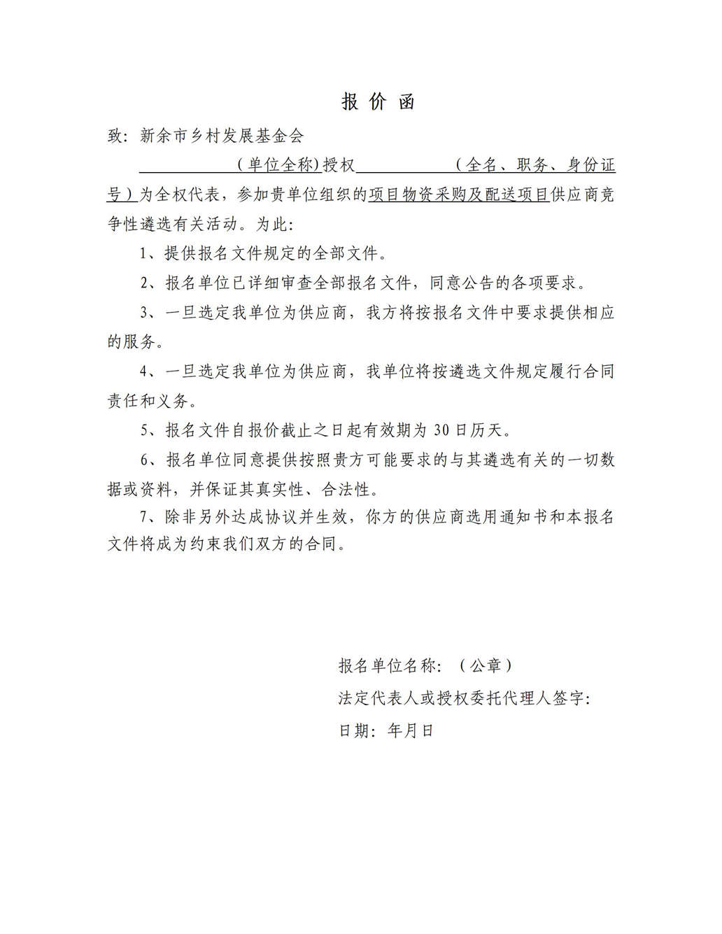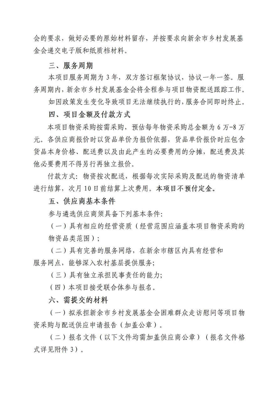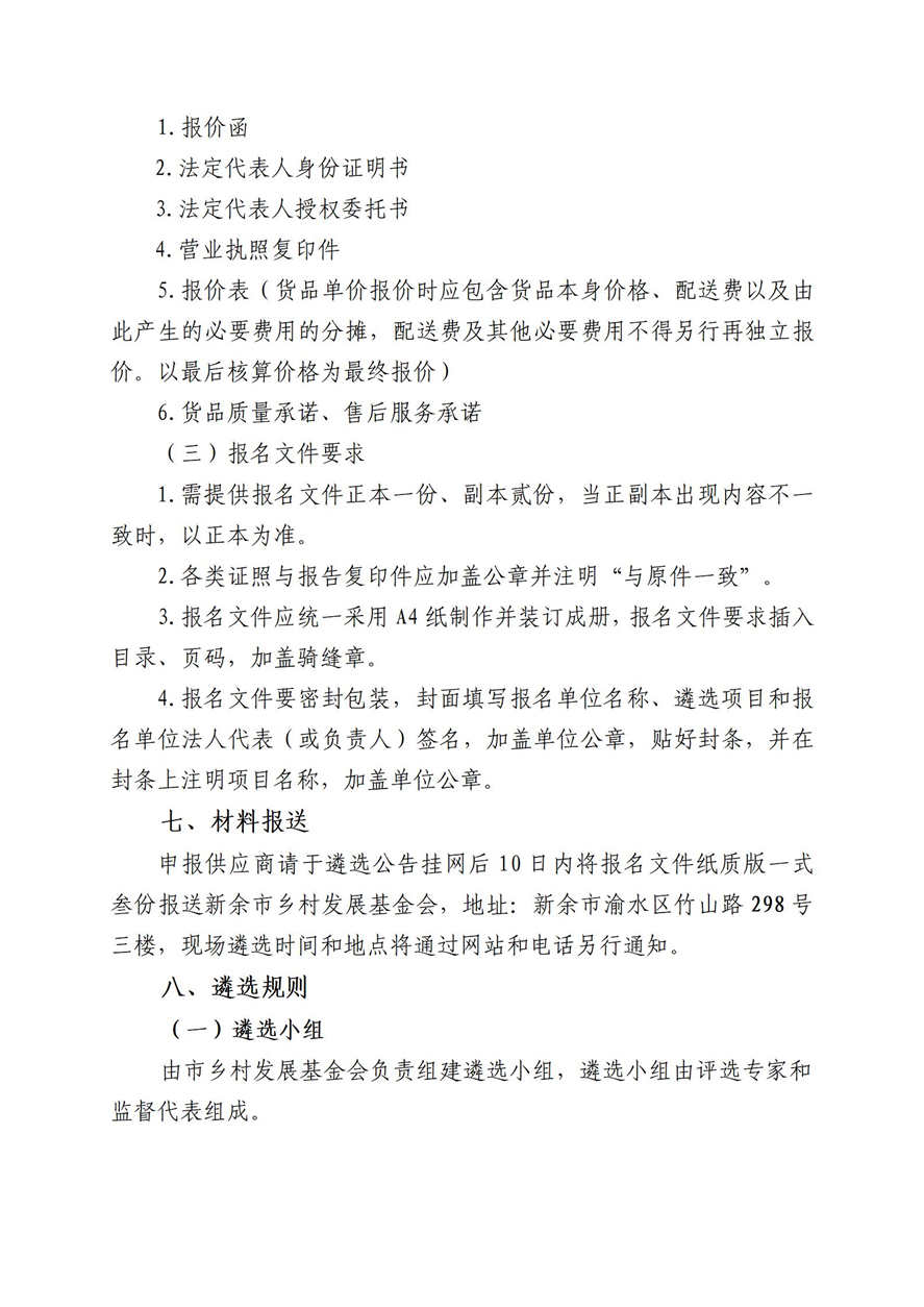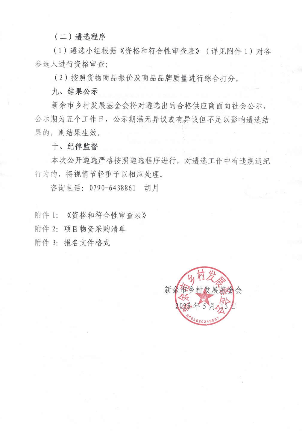1.请参加竞争性遴选的供应商在公告发出10日内将公告内所需材料上交至新余市乡村发展基金会,逾期无效。