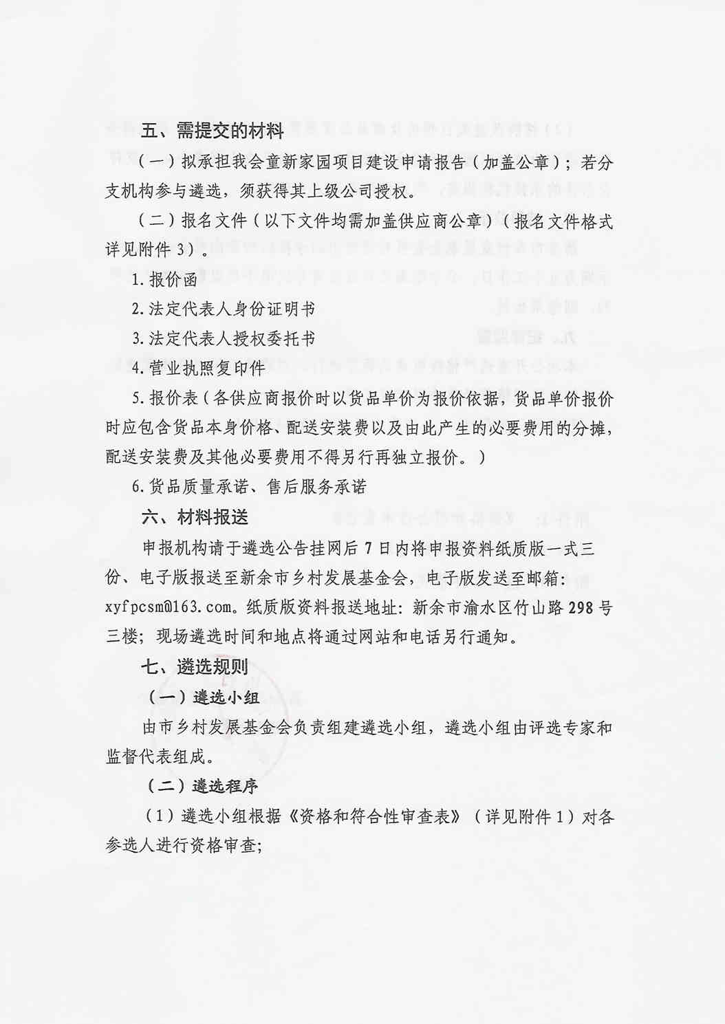 1.请参加竞争性遴选的供应商在公告发出7日内将公告内所需材料上交至新余市乡村发展基金会,逾期无效。